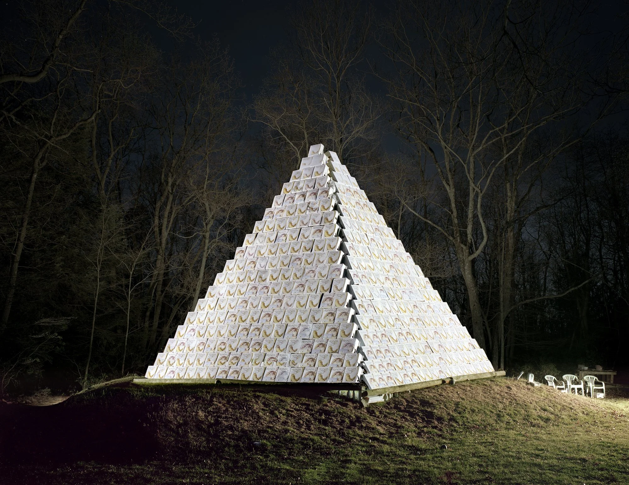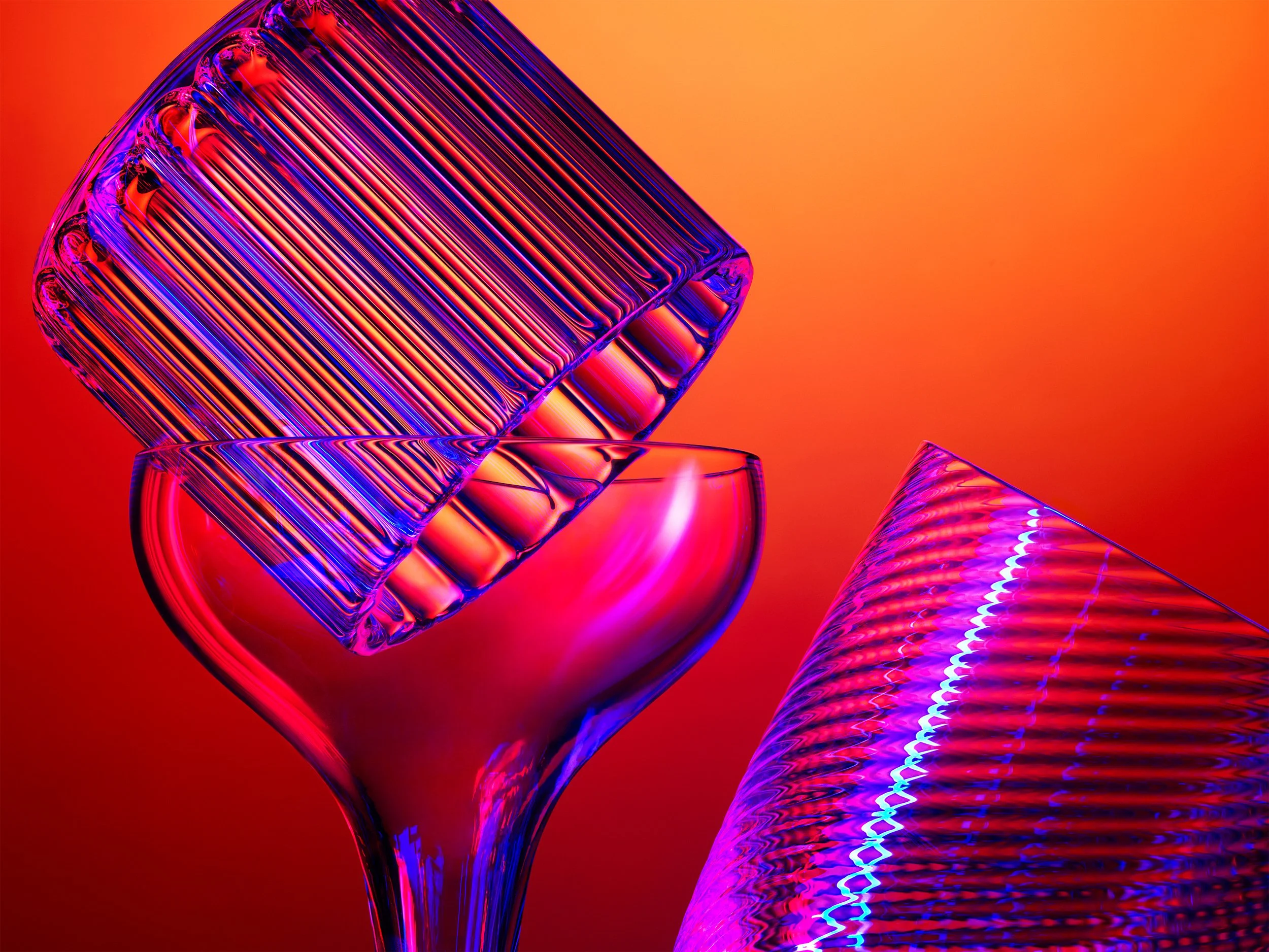 Colorful glassware including a tilted glass with a rectangular, striped glass piece resting on its rim and a conical glass with a ridged texture against a vibrant red-orange background. View fullsize