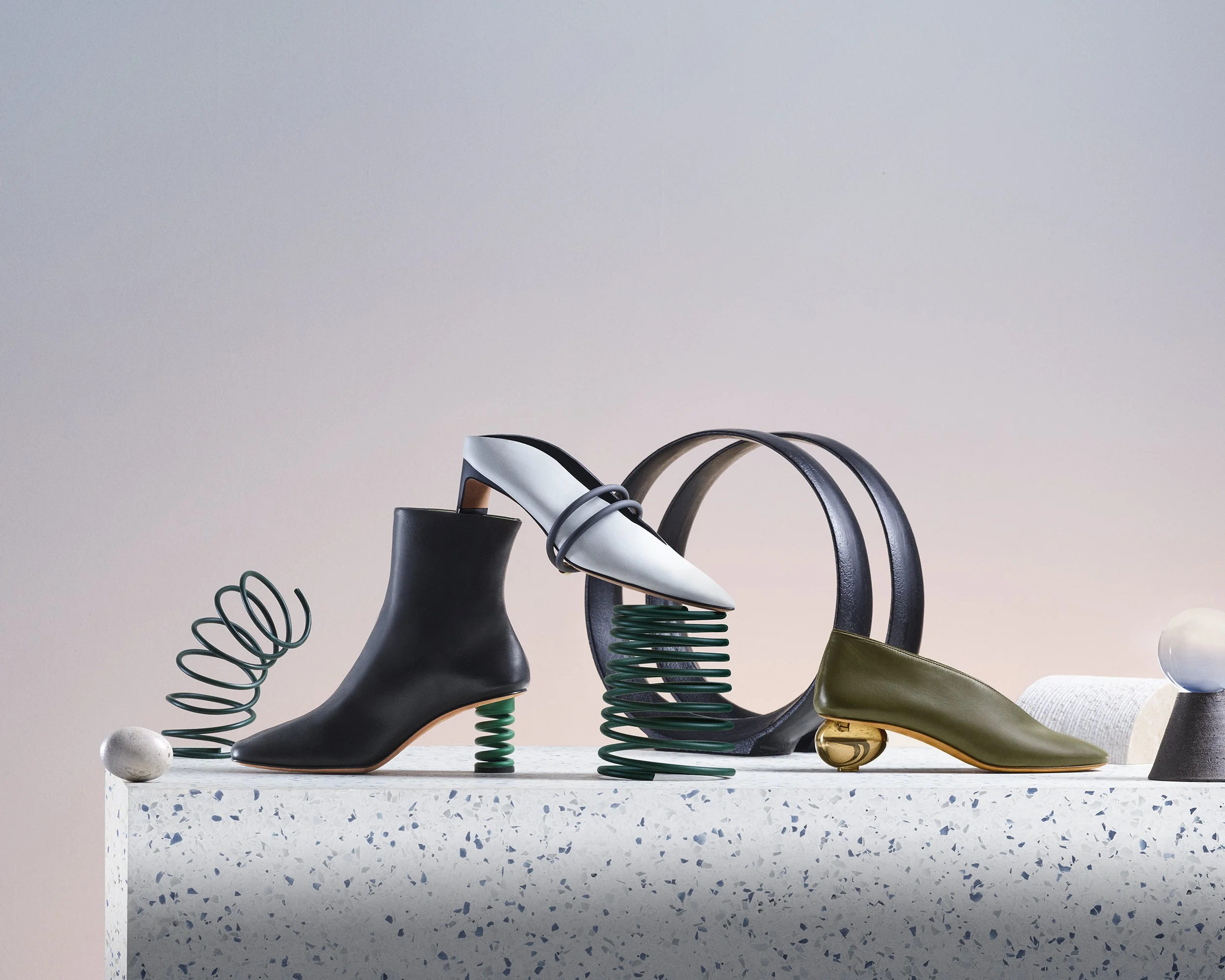 Three black watches with different designs are displayed on black rocks against a pink background with scattered black debris. View fullsize