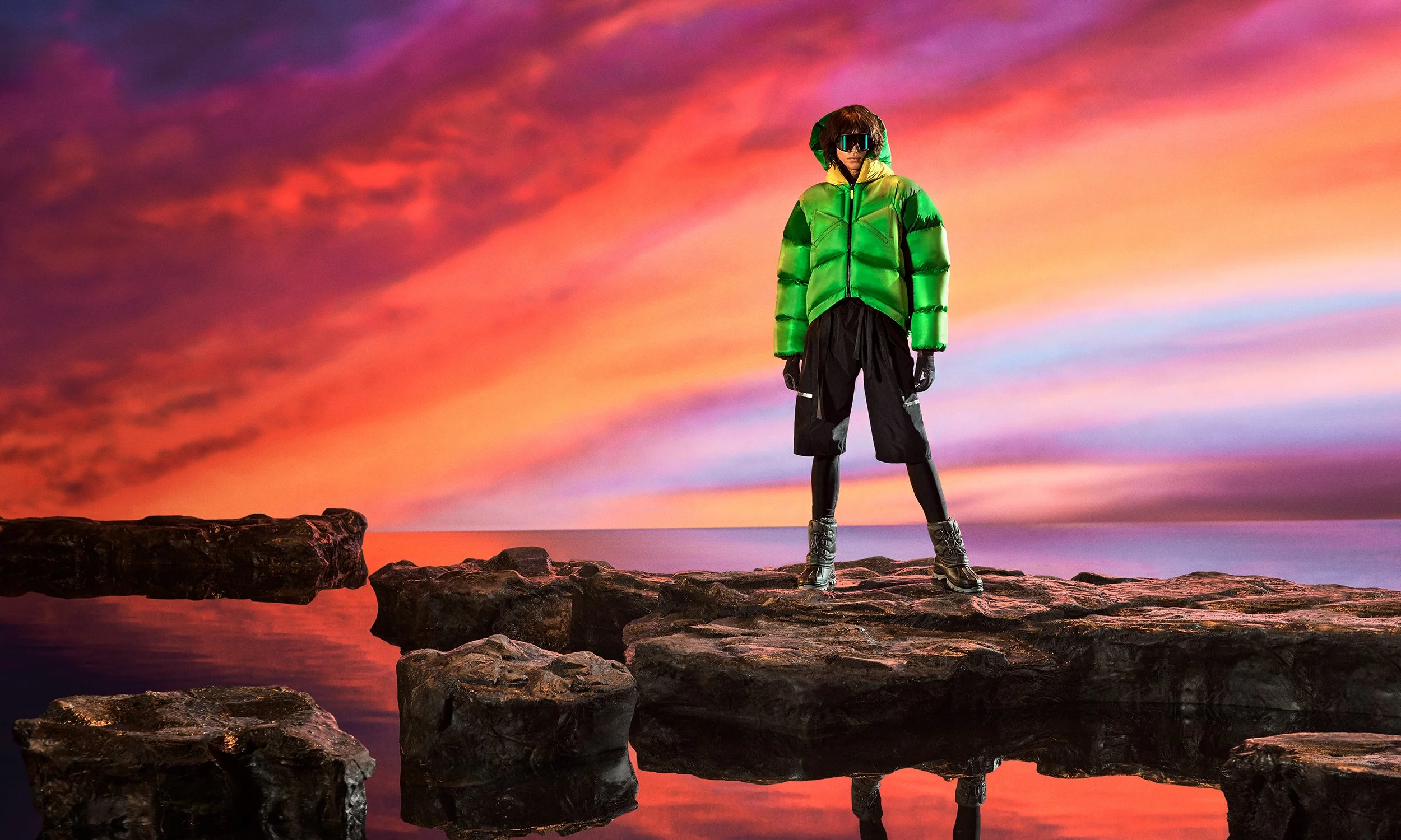 Person standing on rocky shore at sunset, wearing a green puffy jacket, black shorts, and ski gear, with a colorful sky in the background.
