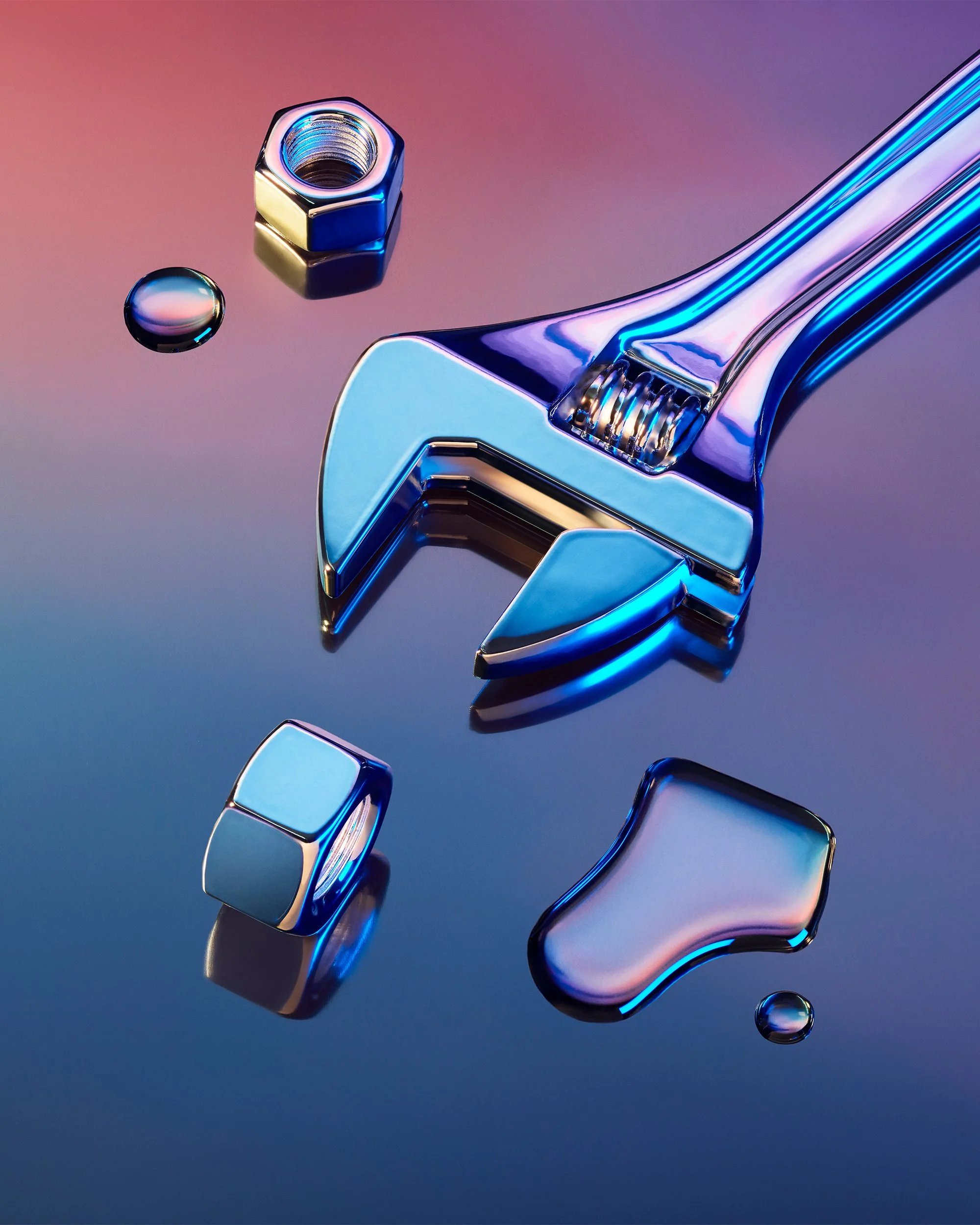 A close-up of a shiny adjustable wrench, a nut, a and a droplet of liquid on a reflective metallic surface with a gradient background. View fullsize