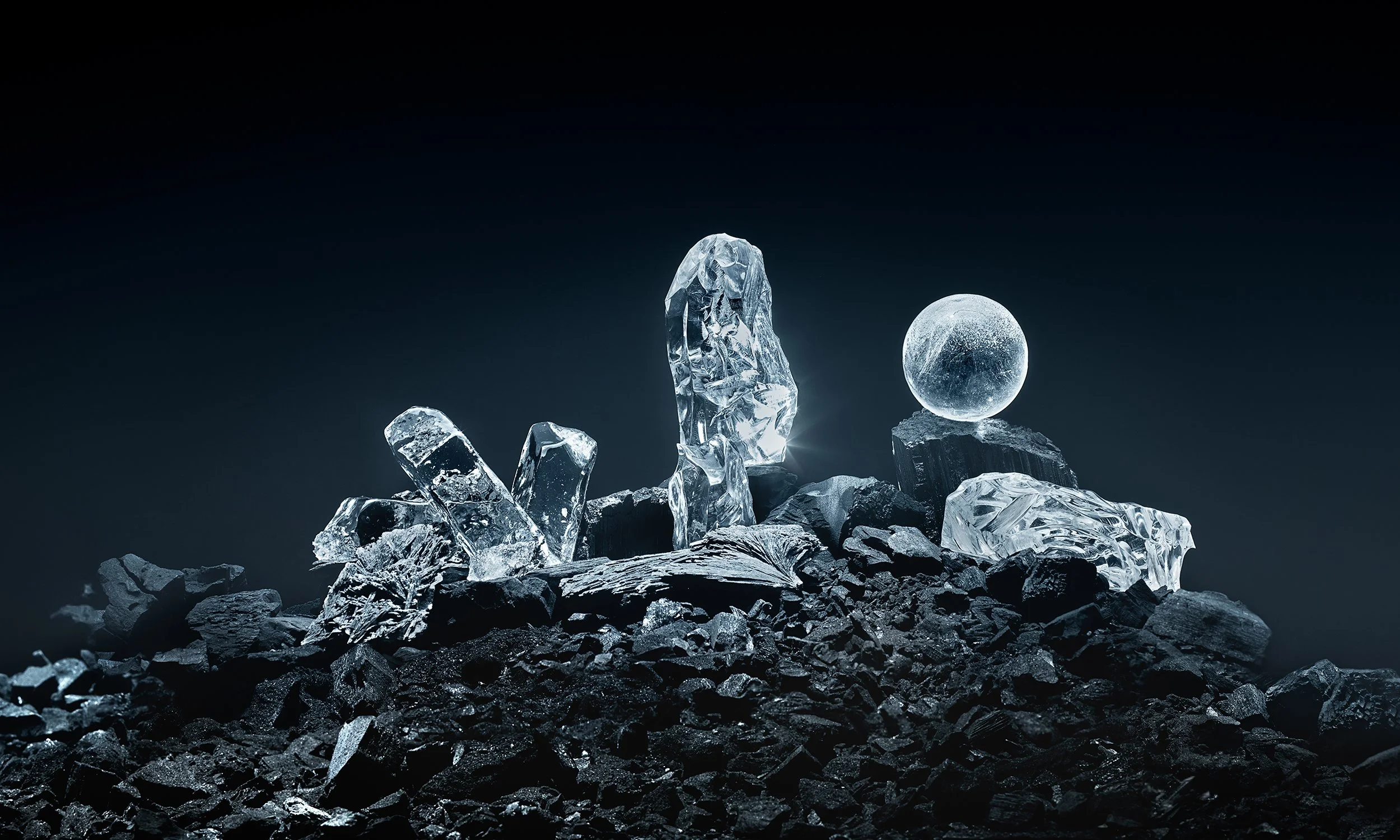 Ice crystals and a glass sphere on dark rocky ground under a dark sky.