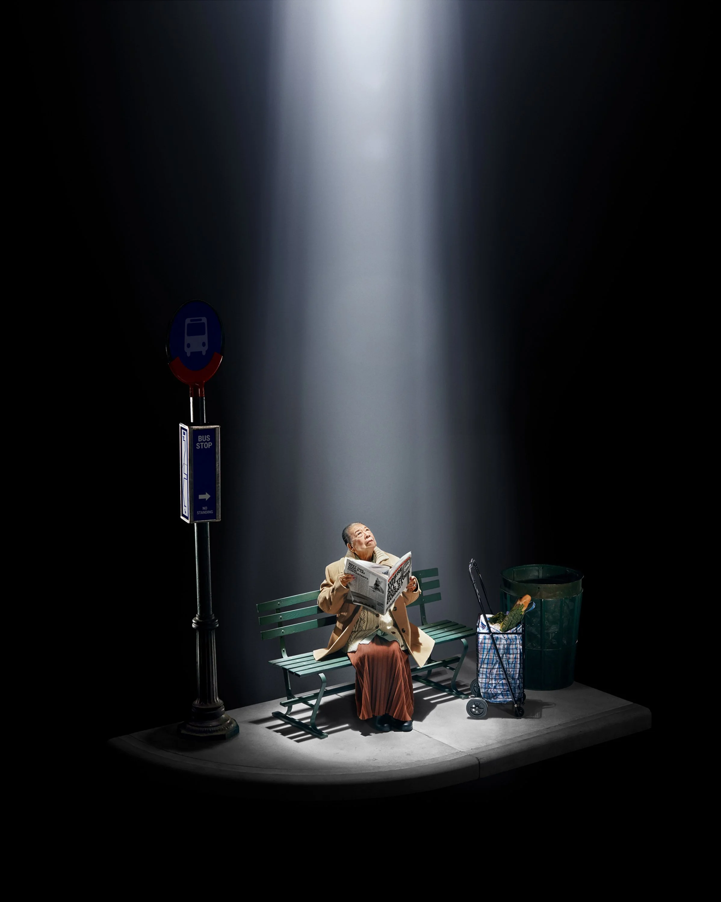 An elderly woman sitting on a green bench at a bus stop, reading a newspaper, with a shopping cart nearby and a trash can, illuminated by a spotlight in an otherwise dark setting.