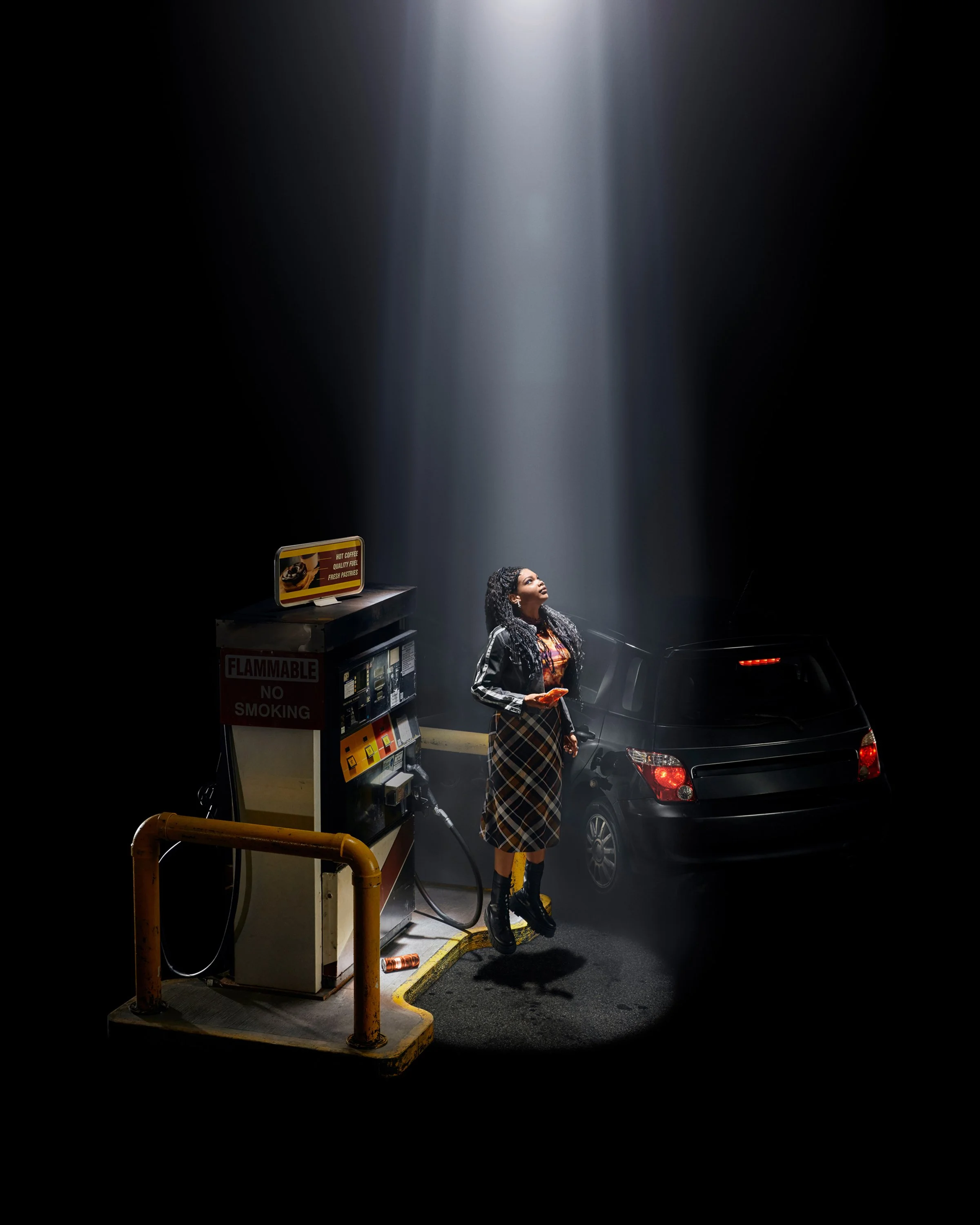 A woman stands under a bright spotlight at a gas station, holding a phone, with a parked car nearby and a gas pump in front of her.