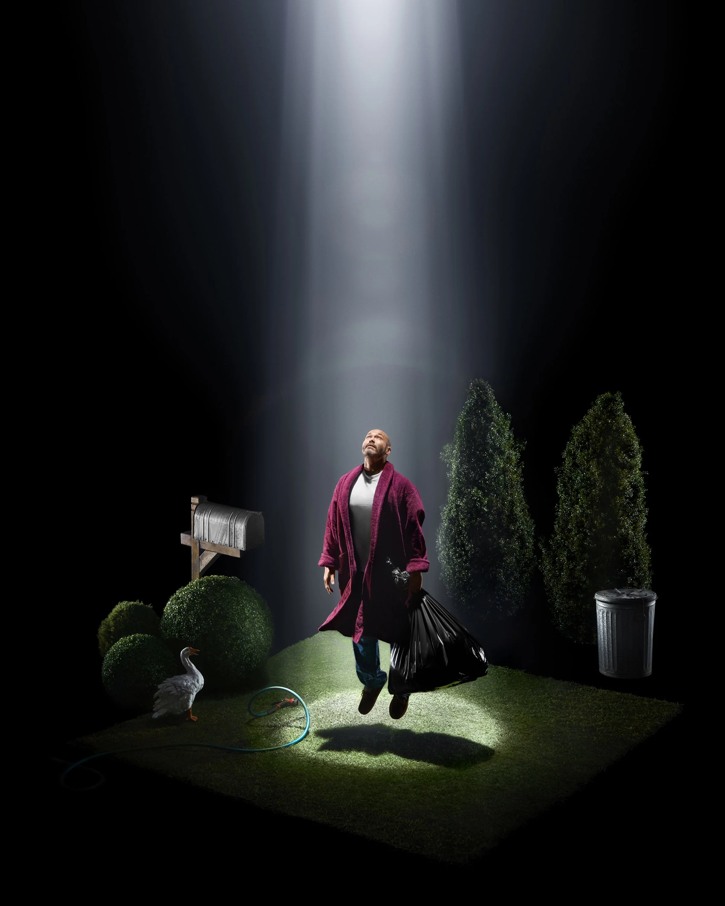 A man in a burgundy bathrobe and jeans is floating in a spotlight with a garbage bag in his hand in a backyard setting, with bushes, a bird, a mailbox, and a trash can visible.
